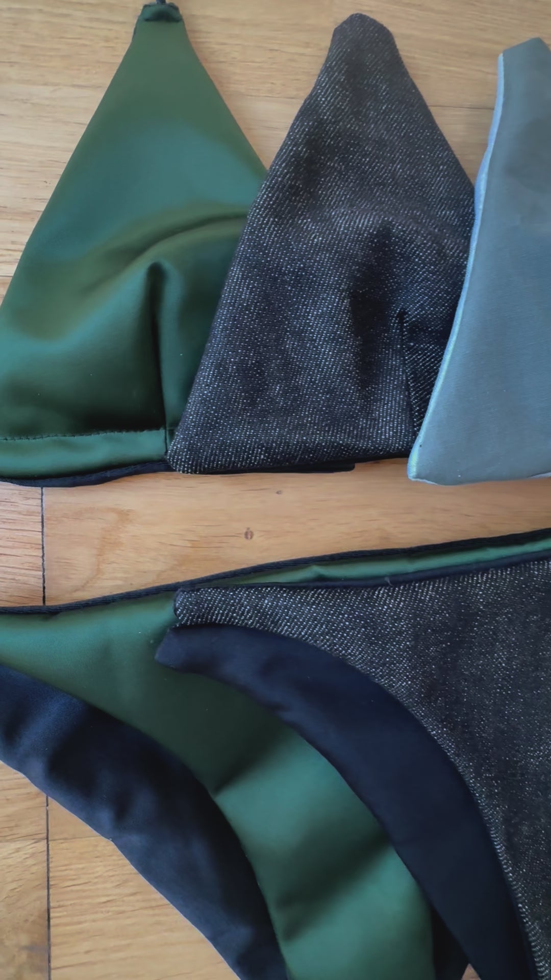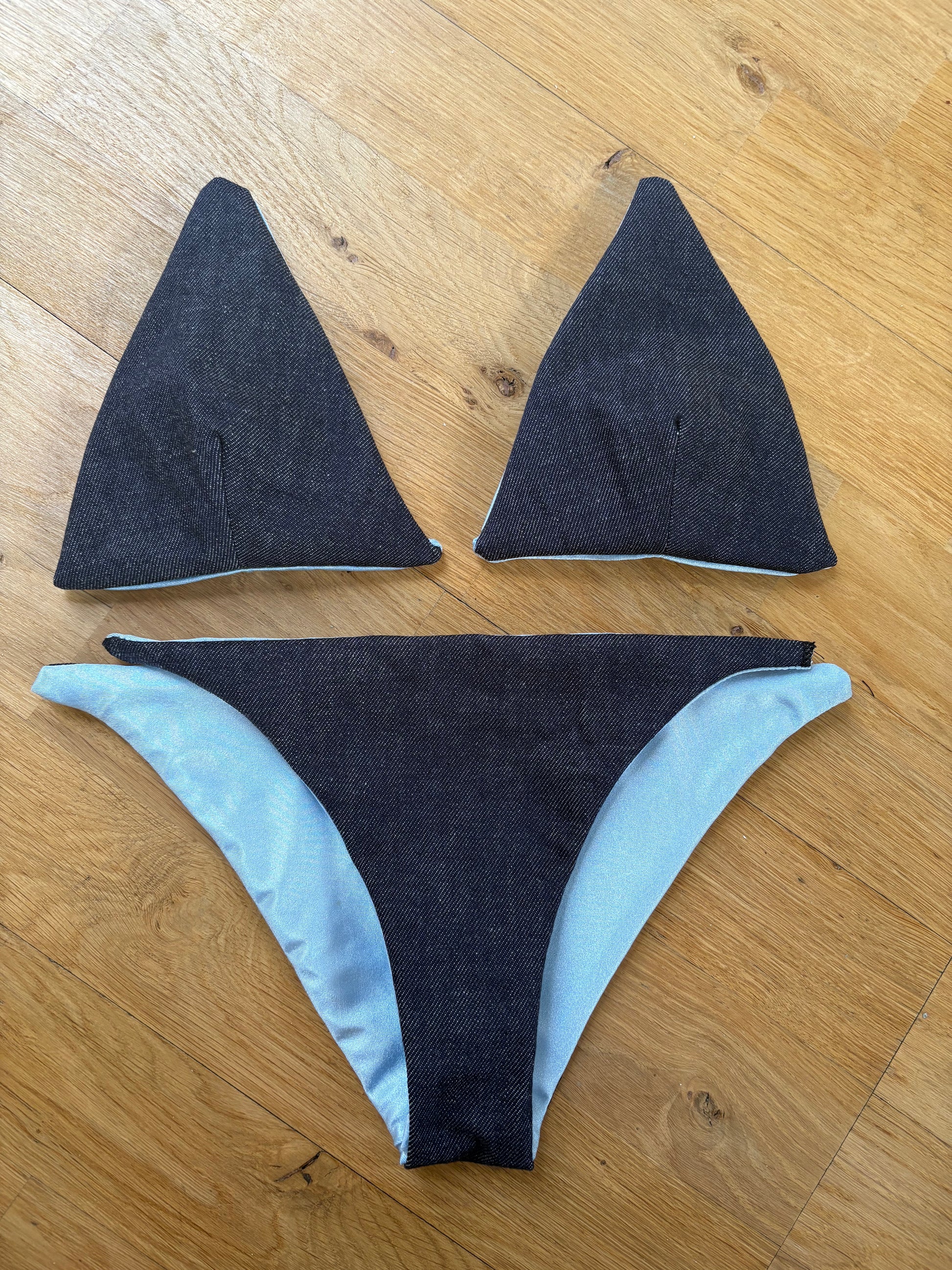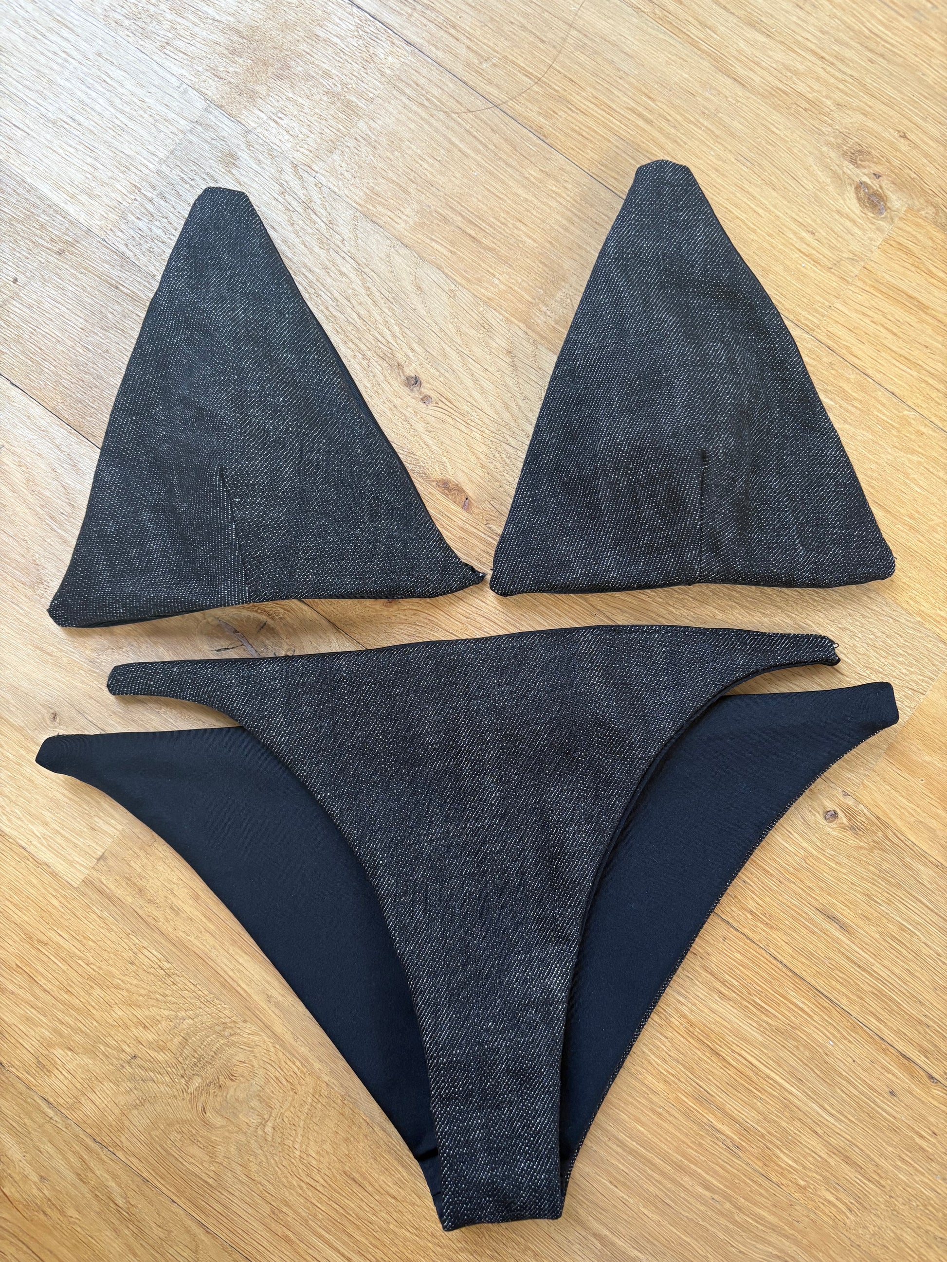 Handmade bikinis, made from the spare fabrics from previous Size-A collections, lined with swimwear fabric. As they are made from upcycled fabrics both sizing and availability is limited. Please enquire for sizing requests or custom sizing.