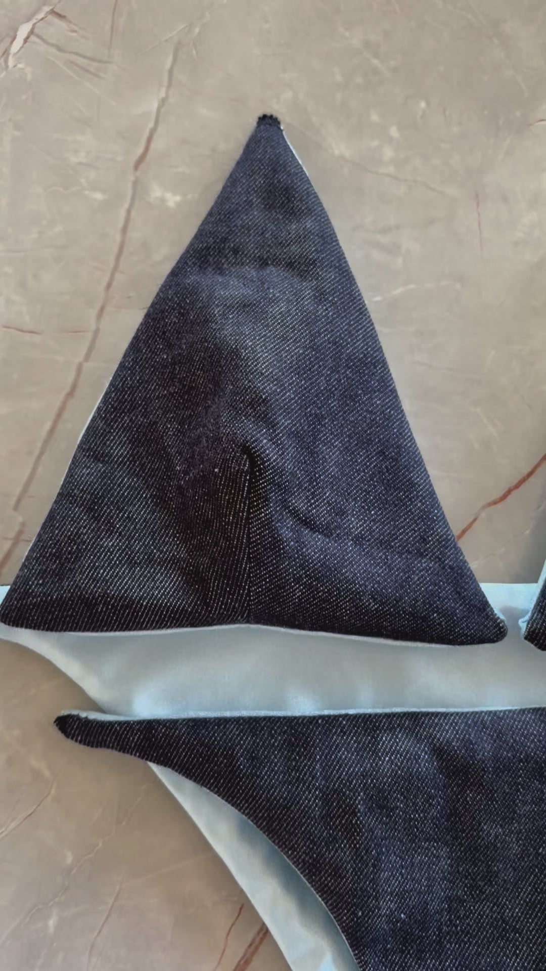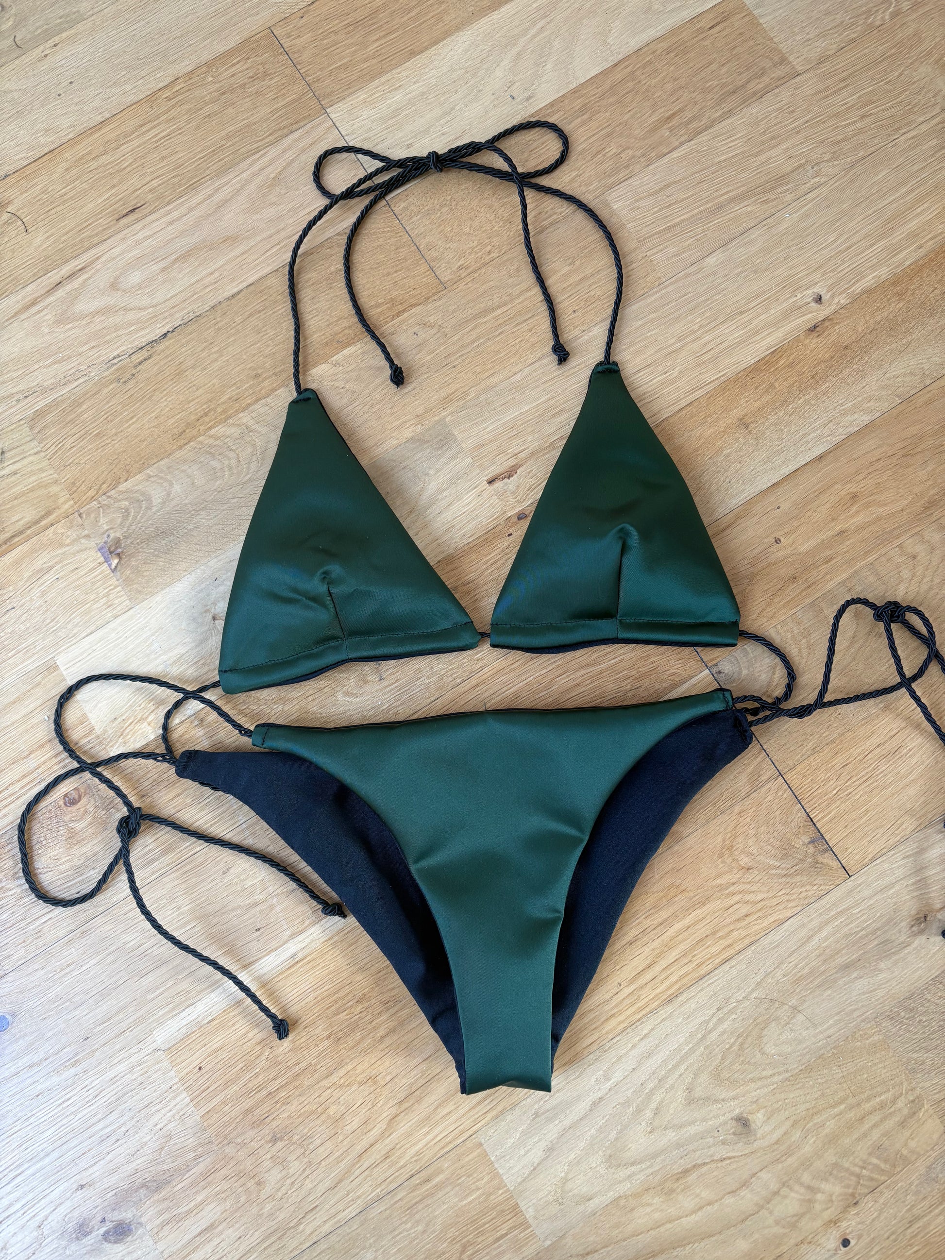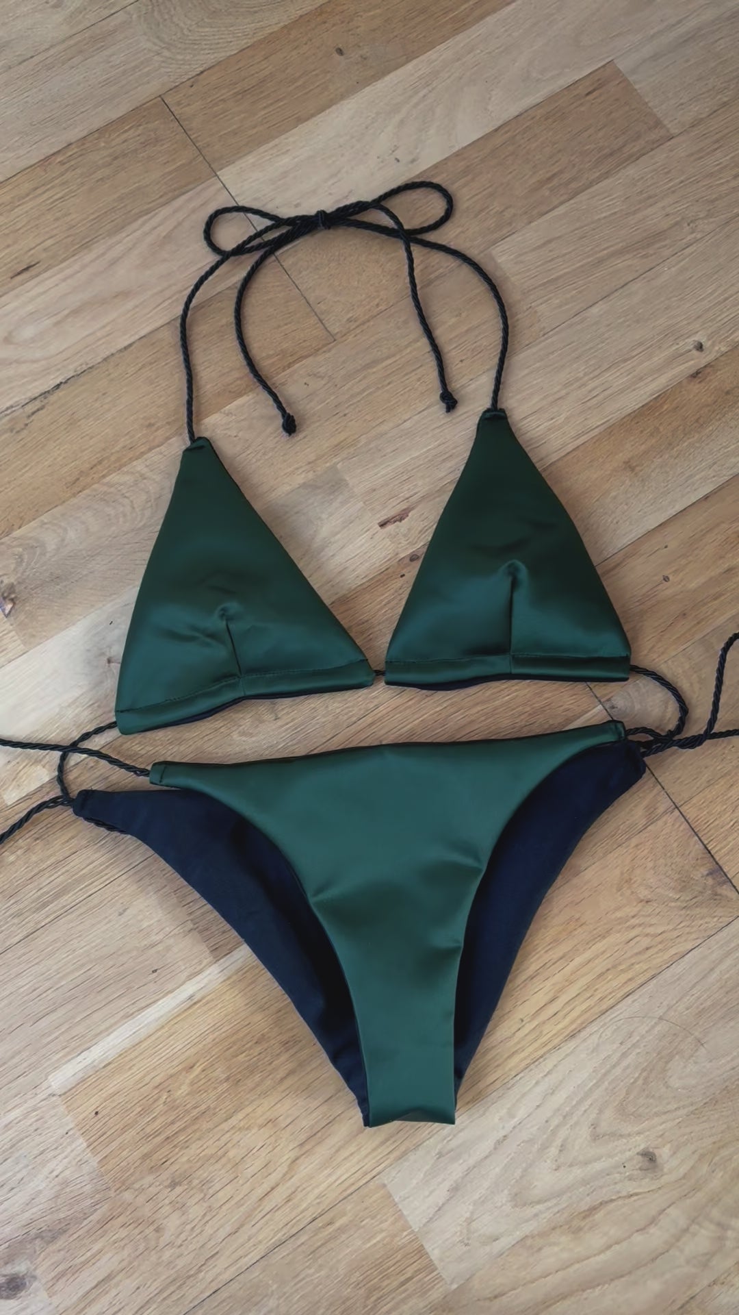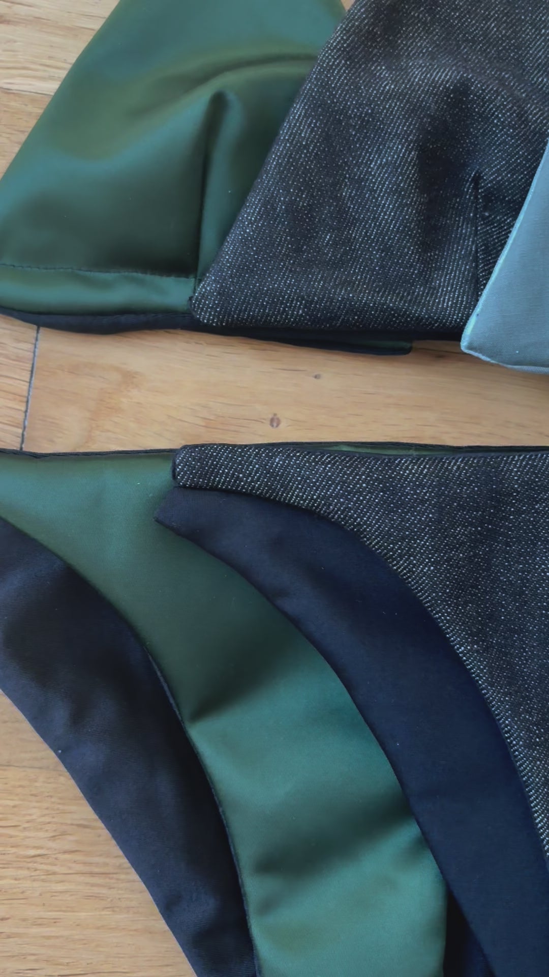 Handmade bikinis, made from the spare fabrics from previous Size-A collections, lined with swimwear fabric. As they are made from upcycled fabrics both sizing and availability is limited. Please enquire for sizing requests or custom sizing.